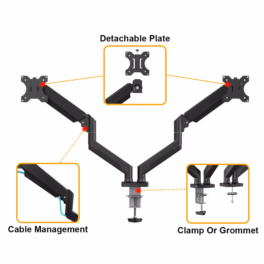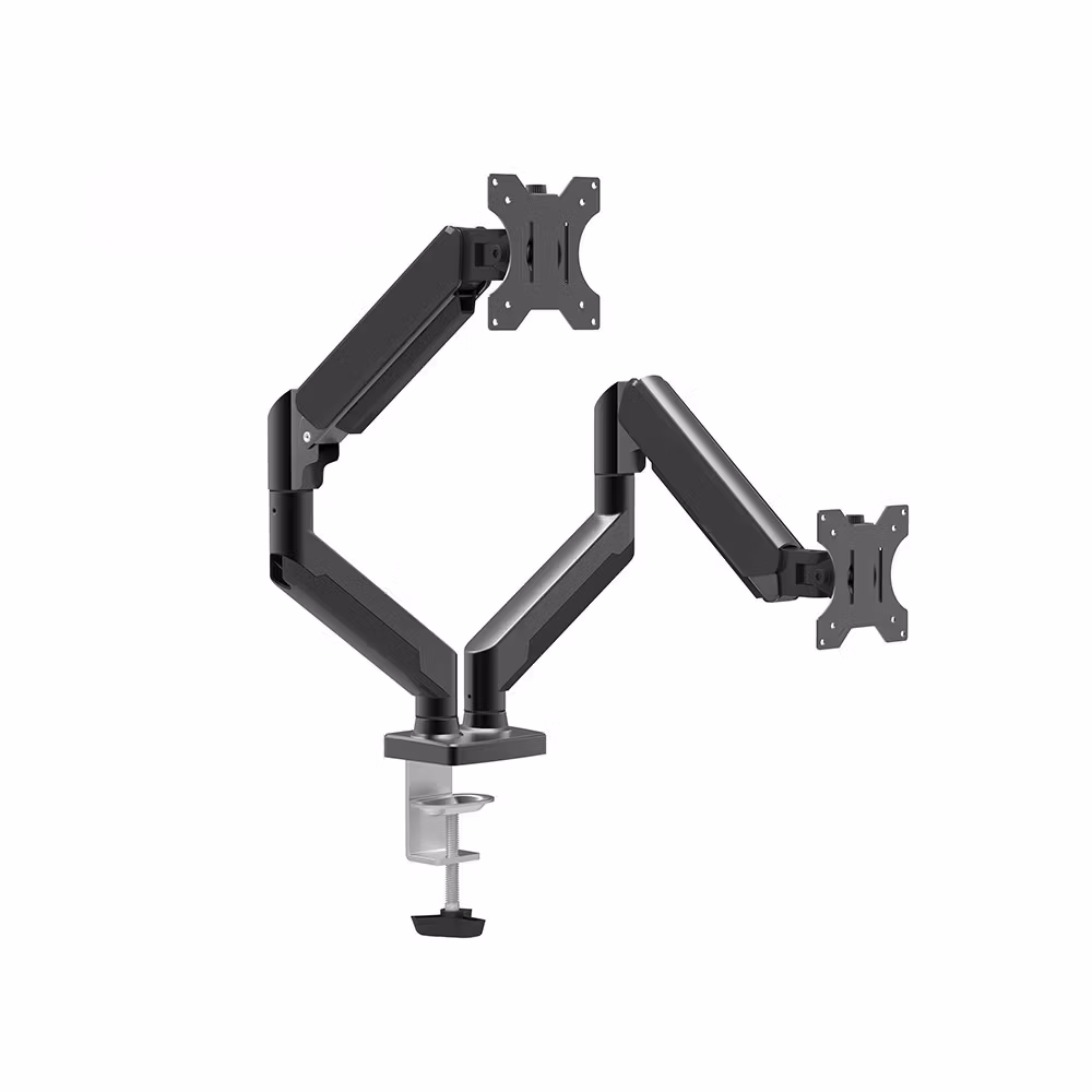 Detta dubbelskärmsfäste med gasfjädring erbjuder smidig höjdjustering och stabil upphängning för dina skärmar. Oavsett om du arbetar eller spelar kan du enkelt justera skärmens position för bästa visningsvinkel och komfort. Fästet stöder mångsidig rotation och lutning, vilket ger dig full flexibilitet att anpassa skärmarna efter dina behov.