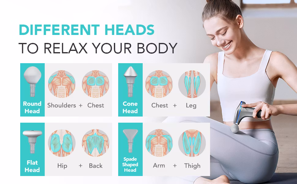 - Utbytbara tillbehör: Levereras med en mängd utbytbara massagehuvuden för att rikta in sig på olika muskelgrupper och ge mångsidiga lindringsalternativ.