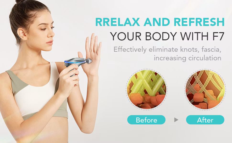 - Lång batteritid: Med sitt uppladdningsbara batteri med hög kapacitet ger F7 timmar av kontinuerlig användning på en enda laddning, så att dina massagesessioner aldrig blir för korta.