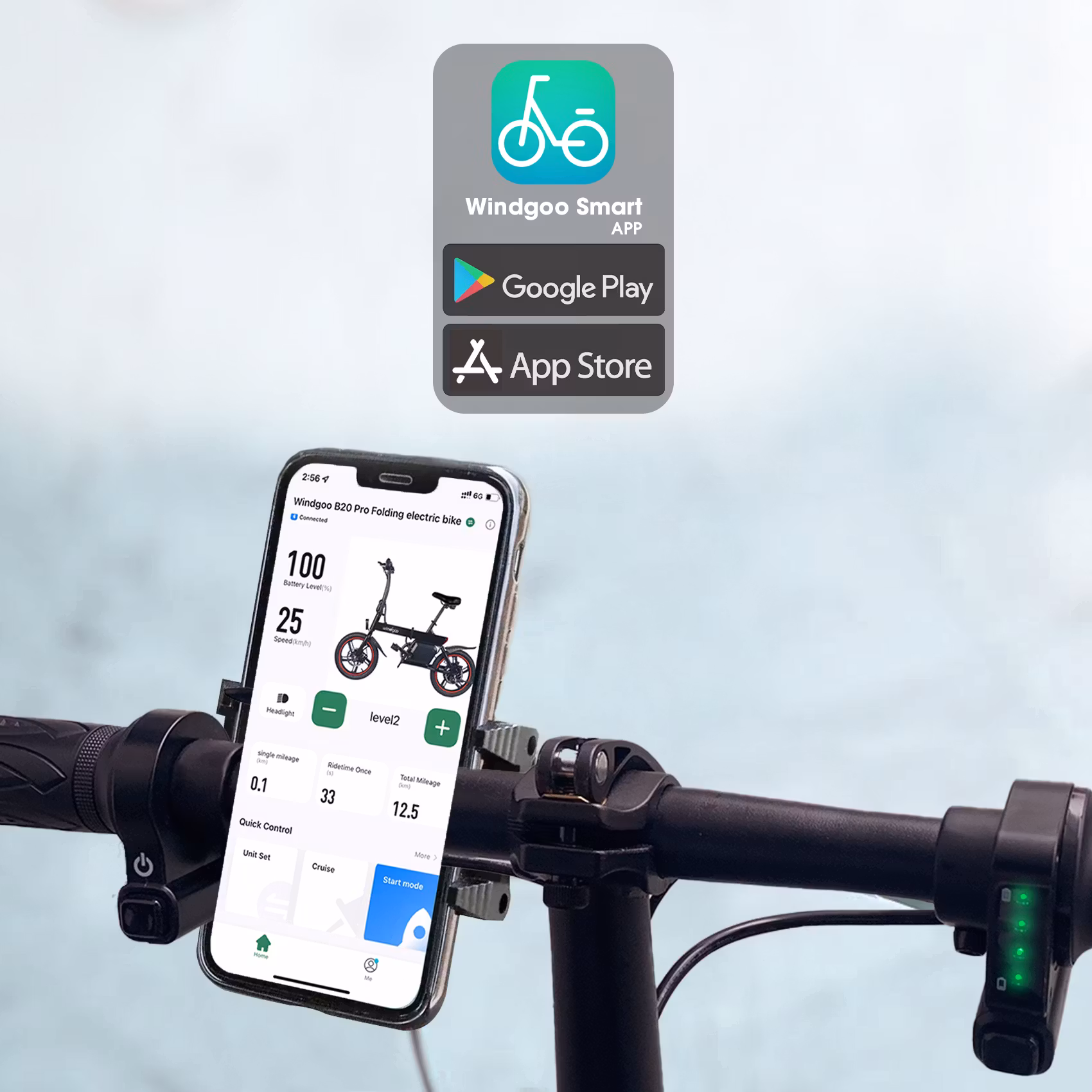 Och det är inte allt - B20 Pro levereras utrustad med det toppmoderna "Windgoo Smart" app-systemet. Kompatibelt med både iOS- och Android-enheter, låter denna smarta app dig vara uppkopplad med din cykel hela tiden. Kontrollera dess status, övervaka dina turer och ha lugn i sinnet med vetskapen om att din cykel alltid är vid din sida, oavsett var dina äventyr tar dig.