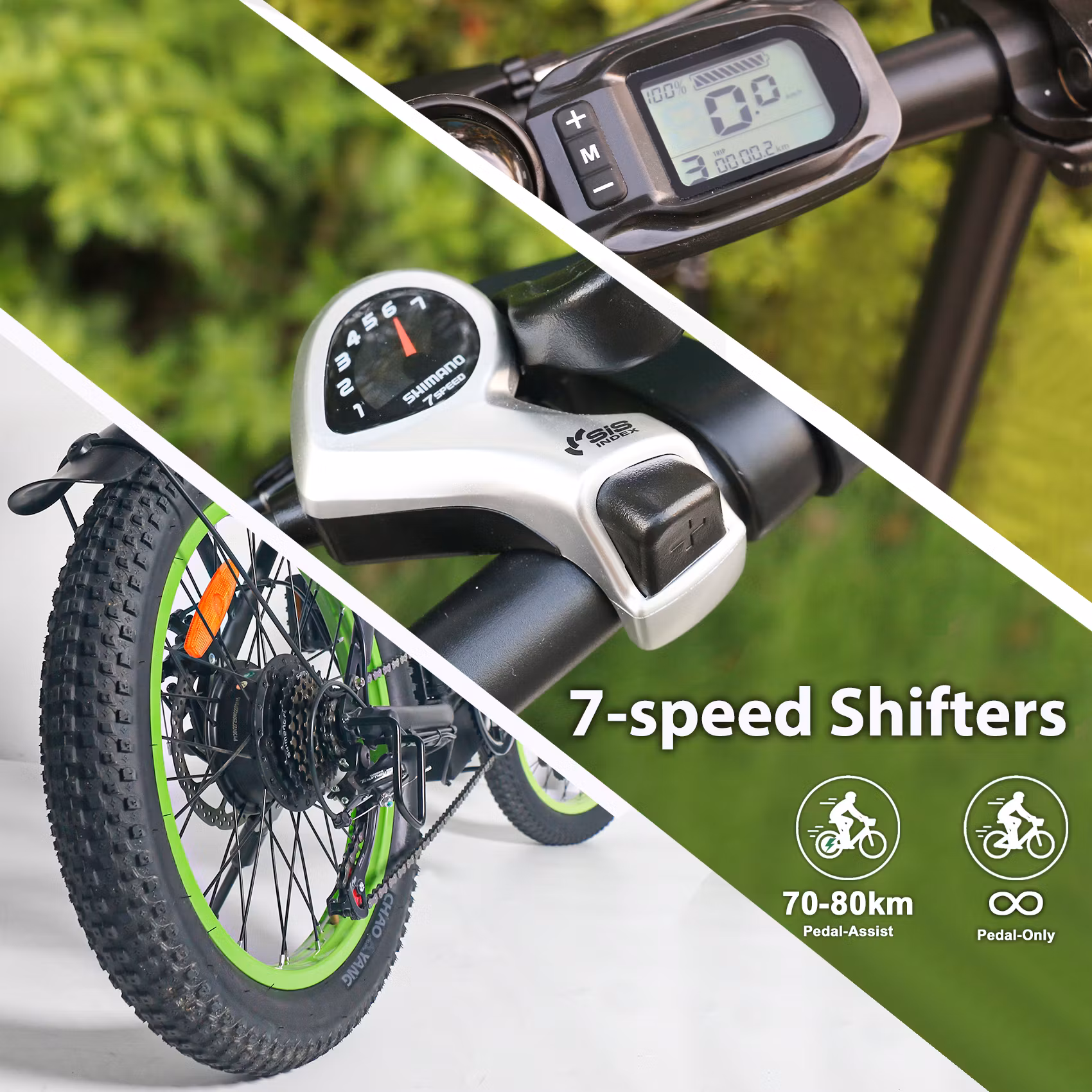 Windgoo E20 har 20"*3,0" feta däck och Shimano 7-växlade växelreglage. De gör det möjligt för dig att cykla i olika vägförhållanden (t.ex. stadsvägar, snö, stränder och steniga bergsvägar) med bättre dragkraft. Du kan flexibelt växla hastighetslägen när du cyklar för pendling och sport.