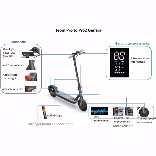 På den stora LED-skärmen kan du få en snabb överblick över din hastighet, körsträcka, körläge och elscooterns batterinivå. Nu kan du även ansluta din Mi Electric Scooter PRO2  till Mi Home-appen och hålla koll på din hastighet och batterinivå direkt i din smartphone. Scootern är kompatibel med Android 4.3 och från och med iOS 9.0.